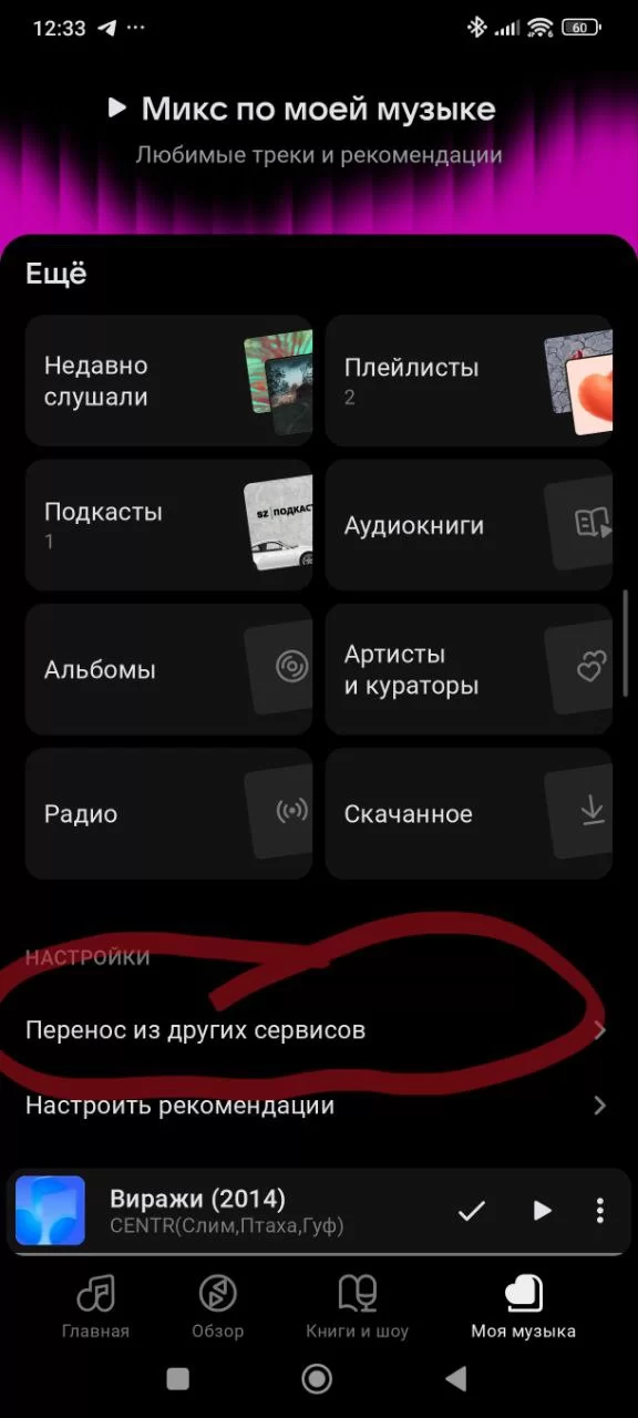 Заходим на вкладку "Моя музыка", листаем вниз, выбираем "Перенос из других сервисов"