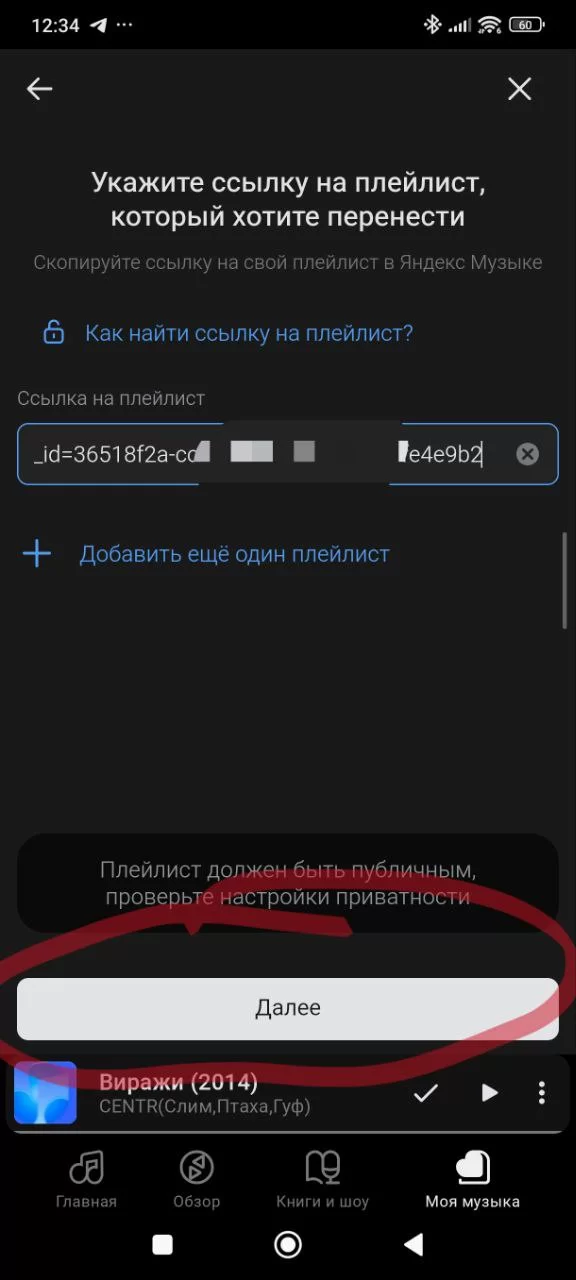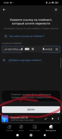 Вставляем ссылку на плейлист ЯМ и нажимаем далее